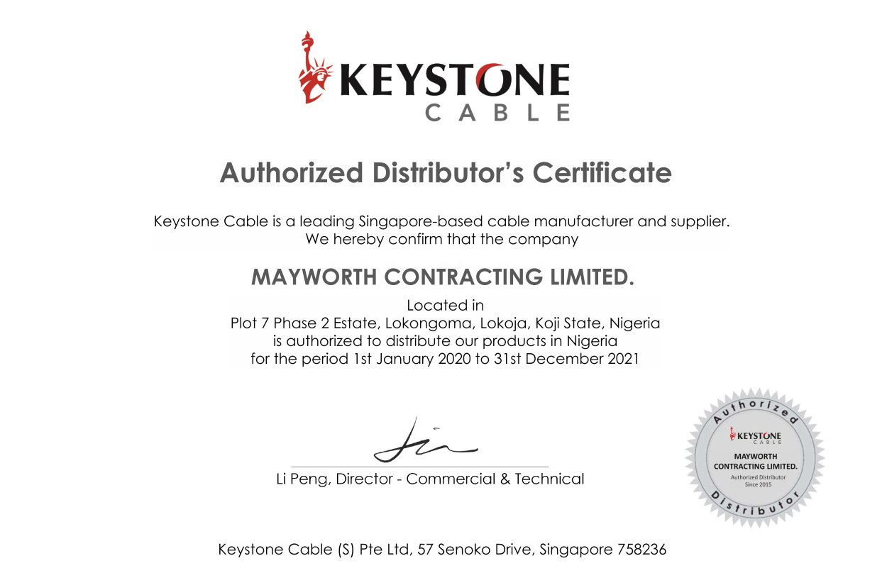 Mayworth Contracting signs Sole Distributorship agreement with Keystone Cable Pte Ltd (a leading Singapore based Cable Manufacturer) for distirbution of Extra Low, Low and Medium Voltage cables across the West African region.